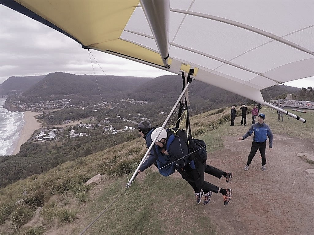 We yelled a conversation about work, moving and our families, as we swept back over the escarpment, turned and ran with the wind stream up the coast. Over the water, we glimpsed breeching whales and swept back to climb again. The wind was freezing, our noses running freely. Circling below, Carol was out gliding with Dan. Thirty minutes passed in a flash and it was time to land, gently like landing on a pillow.